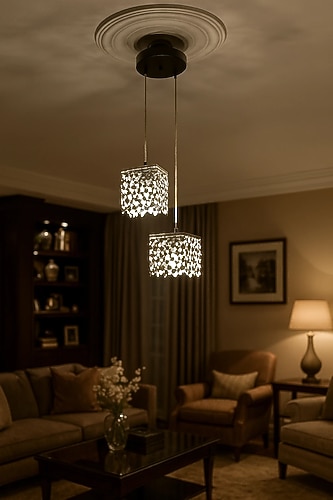 2'li beyaz renk puantiyeli küp sarkıt avize. boyu 80 cm'dir. küpler 13 cm. duyu e27'dir yani standarttır. ampulleri pakete dahil değildir. Ürün 2.el'dir. (4. fotodaki asıldığı yuvarlak parçasında ufak bir ezik vardır bilginize.)