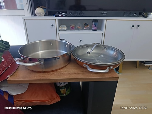 26 sence kısa tencerenin altında bakır vardır üstü çeliktir eee bakın ısıyı daha iletken olduğu için daha iyi pişirir sağında içi çelik dışı bakırdır %10 çelik %90 bakırdır