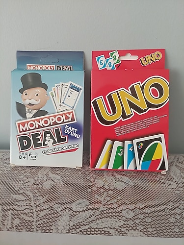 Sıkıldığınız zaman diğerine geçin .... 2-10 kişi 7+, 112 kart, el değiştir kartıyla oyunun kaderini değiştir. Mevcut oyunların haricindede oyunları revize ederek yeni oyunlar keşfedin.El bitene kadar değil de çekme kartları bitene kadar oynayın. Saymayı öğrenen çocuklarınız ile eşleştirme oyunu oynayabilirsiniz,saymayı ve toplamayı daha kolay öğrenebilir. Oynarken sayıları sesli olarak dile getirin sadece Türkçesi değil İngilizce olarak ta sayılar öğretilebilir. Beyin jimnastiğini evde beyin fırtınasınıda işte yaparak eğlenceli 7 den 70'e herkesin eğlenerek oynayabileceği oyun.Canın sıkılırsa emlakçı ol parayı cukkala...