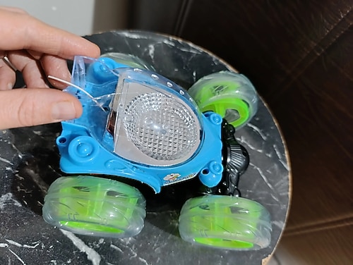 Mavi gövdesi ve parlak yeşil jantlı büyük şeffaf tekerlekleri olan renkli oyuncak araba. Eğlenceli tasarım ve canlı renkler sunar.