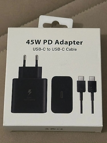 Görseldeki ürün 45W PD adaptör ve USB-C'den USB-C'ye kablodan oluşan bir settir. Hızlı şarj özelliğine sahiptir.