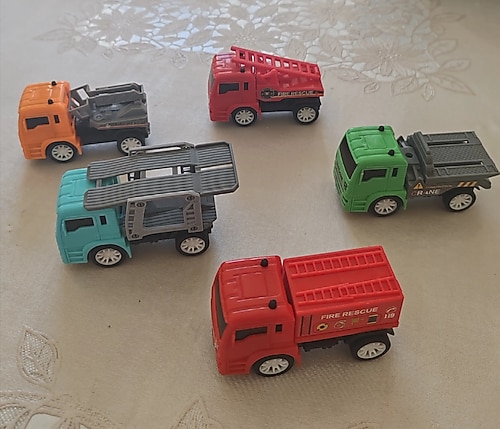 5 adet çek bırak plastik kamyon seti. Sorunsuz sıfır ayarında çalışır durumda.