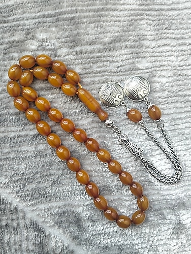 5 yıl önceki döküm Sıkma Kehribar, kayısı mişmişi arası renk, çekimi şıkır şıkır, hatasız ürün, 9-11 mm ölçülerinde günlük çekime Uygun, koleksiyona yakışacak bir eser, püskül yeni olup gümüş kaplama çelik ürün kararma yapmaz 2 dallı uzun ve ağır püskül ile hayran bırakacak eser. Alana hayırlı olsun