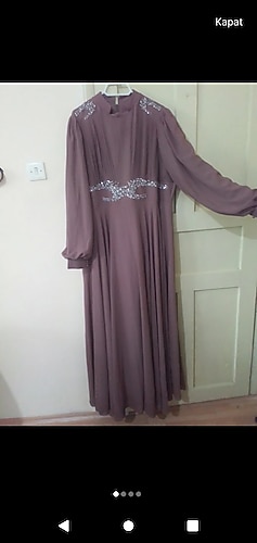 Uzun kollu, kruvaze yakalı mor abiye elbise, drapeli ve bol kesimdir. Omuz ve bel kısmında vintage süslemeler bulunur, düğünler için uygundur. Sadece bir kez giyildi alt etek kısmında bir iki tane ip kaçağı dışında defo vs yoktur 120 kg birisi çok rahat giyebilir