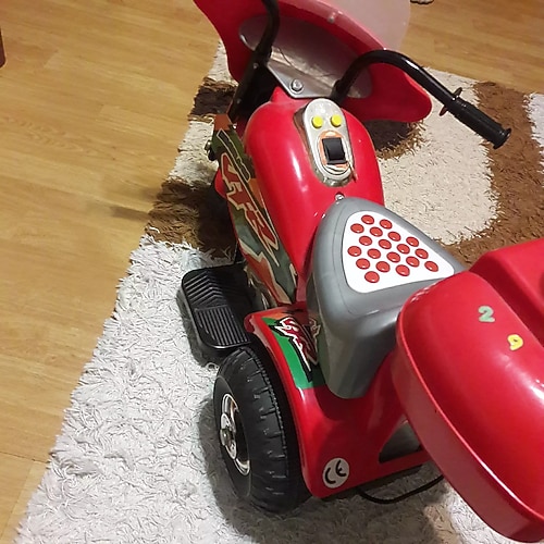Aküsü iyi durumda değil değiştirmek lazım, şarj adaptörü mevcut. Öndeki far çalışıyor ama arkadaki ışıklar bozuk. ileri ve geri gidiyor. gaz pedalı var. uzaktan kumandası yok. torunum büyüdüğü için kullanmıyor.