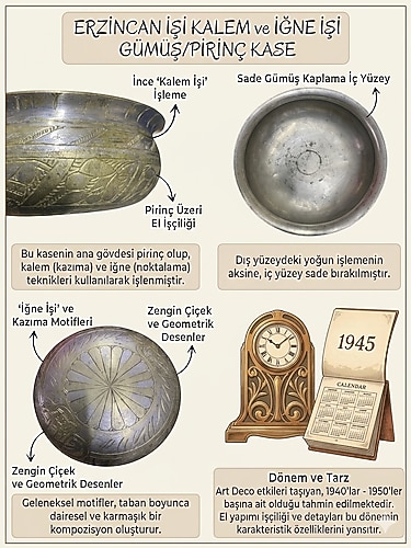 Erzincan işçiliğinin en zarif örneklerinden biri olan bu özel kase, koleksiyonluk değeriyle satışa sunulmuştur. Ana gövdesi yüksek kaliteli pirinç üzerine ince kalem işi (kazıma) ve iğne işi (noktalama) teknikleri kullanılarak usta ellerde işlenmiştir. İç yüzeyi sade gümüş kaplama olup dış yüzeyindeki zengin çiçek ve geometrik motiflerle tam bir görsel şölen sunmaktadır. 1940-1950 dönemine ait Art Deco etkileri taşıyan bu nadide parça, el yapımı işçiliği ve dönemin karakteristik detaylarını üzerinde barındırmaktadır. Formu ve kondisyonu kusursuzdur, her türlü dekorasyona antik bir dokunuş katar. Alıcısına şimdiden hayırlı olsun.