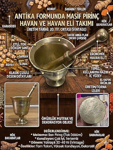 Koleksiyonluk ve günlük kullanıma uygun, antika formunda masif sarı pirinç havan ve havan eli takımı. 898 gram ağırlığıyla oldukça tok ve etli bir dökümdür. Yaklaşık 30-40 yıllık vintage bir ürün olup kondisyonu mükemmel durumdadır. İç yüzeyi tertemiz ve kullanıma hazırdır; baharatlarınızı dövmek için ya da mutfağınızda dekoratif bir obje olarak değerlendirebilirsiniz. Torna izleri ve klasik çizgili desen detaylarıyla el işçiliğinin estetiğini yansıtır. Ergonomik tutuşlu havan eliyle birlikte tam takım olarak teslim edilecektir. Kaçırılmayacak kalitede, ömürlük bir parçadır. Alıcısına şimdiden hayırlı olsun.