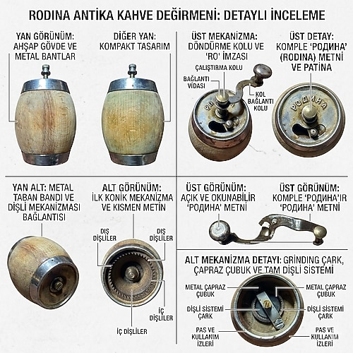 Sovyet döneminden kalma nadir "Rodina" marka ahşap kahve ve baharat değirmeni. Ürün masif ahşap gövdeye ve sağlam çelik öğütme mekanizmasına sahiptir. Üst kapaktaki küçük sabitleme pimi dışında hiçbir eksiği yoktur, bu durum kullanıma engel değildir. Mekanizması aktif ve sorunsuz çalışmaktadır. Yaşına bağlı oluşan doğal patinası ile harika bir görsel sunar. Sadece genel bir temizlik yapılarak vitrine veya kullanıma hazır hale getirilebilir. Koleksiyon değeri yüksek, ticari getirisi olan antik bir parçadır. Detaylar fotoğraflarda görüldüğü gibidir.
