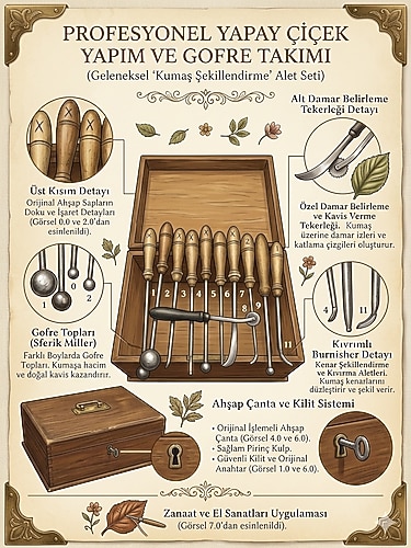 Zanaatkarlar ve koleksiyonerler için nadir bulunan, profesyonel antika yapay çiçek yapım seti satışa sunulmuştur. Geleneksel kumaş şekillendirme sanatında kullanılan bu özel takım; farklı boyutlarda gofre topları (sferik miller), damar belirleme tekerleği ve kenar kıvırma aletlerinden (burnisher) oluşmaktadır.