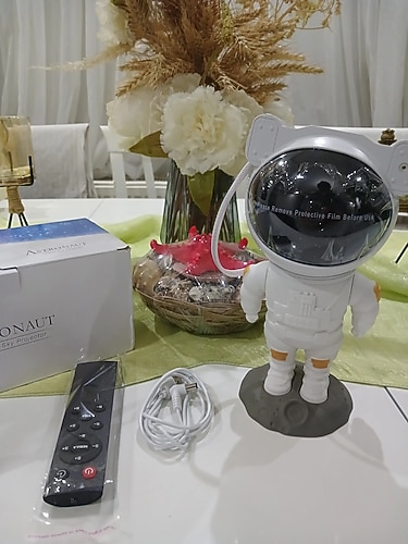 Astronot figürlü, uzaktan kumandalı galaxy yıldız projektörü. Odayı renkli yıldız ve uzay efektleriyle aydınlatır. Hem dekoratif hem gece lambası olarak kullanılabilir.