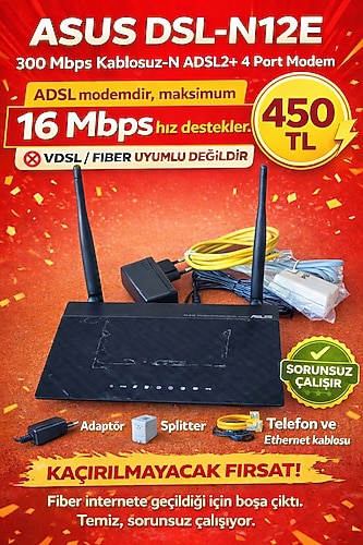 Yanında adaptörü, Telefon Kablosu Splitter ve Ethernet kablosu bulunmaktadır.