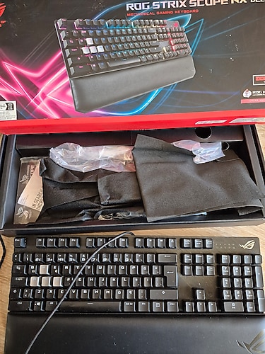 sıfırdan farksız kutu içeriği tamdır. garanti bitmek üzere faturayı bulamıyorum fakat ürün Asus da kayıtlıdır. hiçbir problemi sıkıntısı yoktur tuş takımında renk kaybı yoktur ledler kusursuz çalışmaktadır, üzerine sıvı temas dahi etmemiştir.