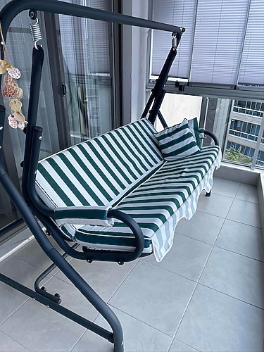 Ürün eriznöz markadır. 5 yıldır kullanılması sebebiyle minder kılıfında deformeler vardır ancak düzelmeler yapılmıştır kullanım konusında sorun çıkarmamaktadırTüm aksesuarları(üst tente, yastık, minder vb) mevcuttur. Sürekli cam kaplı balkonda kullanıldığı için yıpranma az olmuştur. Bu tip ürünlerde belirli kullanımdan sonra olduğu kadar gıcırtı var.üç kişiliktir.