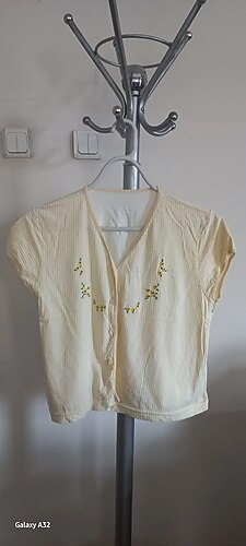 Bayan Yazlık Bluz: Lekesi ve yırtığı yoktur. Penyedir. Önü işlemelidir. Kumaş ve beden etiketi yoktur. Ütüsüzdür. M bedene olur diye düşünüyorum. Ancak iade olmadığından verdiğim ölçülere göre alım yapınız. Boy 50 cm.-Koltuk altından itibaren boyu 29 cm.-Koltuk altından koltuk altına tek taraftan eni 51 cm. (Esneme 4 cm.)-Orta kısımdan tek taraftan eni 52 cm. (Esneme 4 cm.)-En altından tek taraftan eni 52 cm. (Esneme 4 cm.)-Omuz 12 cm.-Kol boyu 12 cm.-Ense açıklığı 15 cm. (Esneme 4 cm.)-Yaka açıklığı 14.5 cm.-Kol oyuntusu 21 cm. (Esneme 3 cm.)-Kol girişinin tek taraftan eni 14 cm. (Esneme 3 cm.)-Düğme 1 cm.'dir. #bluz #bayan bluz #kadın bluz #penye bluz #kısa kollu bluz #işlemeli kadın bluz #işlemeli bayan bluz