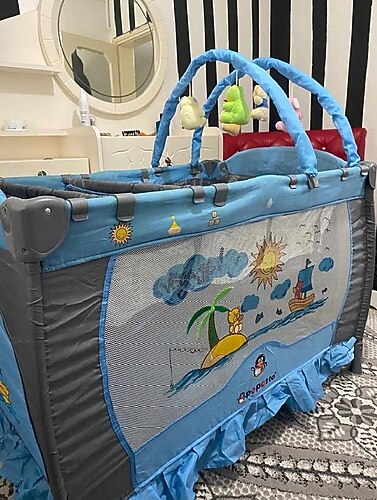 fotograflarda göründüğü gibidir herhangi kırık yeri yok altı oyun parkı oluyor cantasında durduğu için kırışık duruyor cektigim demirlerin ikisi altına takılıyor besigi sallaması icin digerleri de tül perdesi icin tülü olmadıgı icin takıp foto cekemedim demirleri var ama üstünde takılı olan uzun diktörtgen seyde bebegi yatırıp altını temizlemek icin yada bez ıslak mendil koyabilirsiniz istersenizde takmazsanız siz bilirsiniz