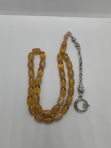 7*11 mm Ölçülerinde Atölye İşi Gümüş Kaplama İmitasyon Ayyıldız Püskülle Dizayn Edilmiş Beyaz Hareli Sıkma Kehribar. Alıcısına Şimdiden Hayırlı Olsun.