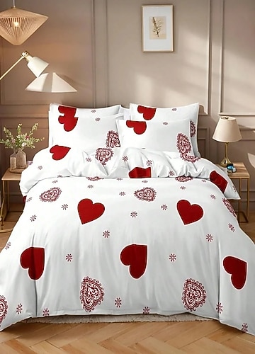 Beyaz Üzerine Kırmızı Kalp Desenli çift kişilik Nevresim Takımı çarşaflı