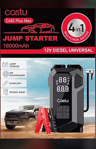 16000mAh Kompresörlü Akü Takviye Cihazı | 4’ü 1 Arada Jump Starter Akü takviye • Hava kompresörü • Powerbank • LED fener — 12V araçlar ile uyumlu Yolda kalma, lastik inmesi ya da telefon şarjının bitmesi gibi durumlarda tek cihazla çözüm üretin. 16000mAhkapasiteli bu akü takviye cihazı; jump starter, lastik şişirme, USB powerbank ve LED aydınlatmaözelliklerini taşınabilir bir tasarımda bir araya getirir.