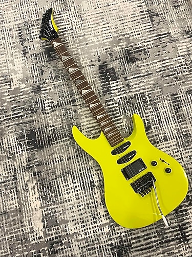 Gitarın sorunları resimde eklenmiş ön taraftan görünmüyor. Celebrity, modeli ise ünlü akustik gitar üreticisi Ovation (Kaman Music Corporation) tarafından 1980'lerin sonu ve 1990'ların başında üretilen "Superstrat" serisine ait bir elektro gitardır. Bu, özellikle o dönemin "Hair Metal" ve rock tarzına uygun olarak üretilmiş, nadir görülen bir modeldir. Gitarın Özellikleri • Marka/Model: Celebrity by Ovation • Menşei: Kore yapımıdır • Gövde Tarzı: "Superstrat" (Fender Stratocaster'ın daha sert tonlar ve hızlı çalım için modifiye edilmiş, keskin hatlı versiyonu). • Klavye: "Sharktooth" (köpekbalığı dişi) şeklinde sedef işlemeleri (inlay) vardır. Bu, o dönemde Ibanez ve Jackson gibi markaların popüler modellerinde sıkça görülen bir özelliktir. • Renk: Neon Sarı (80'ler estetiğini yansıtan tipik bir renk).