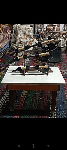 üç adet standlarıyla beraber 50 cm 46 cm 39 cm ölçüleri uçları çelik ağızları kapalıdır kesmez saplar ahşap alana hayırlı olsun