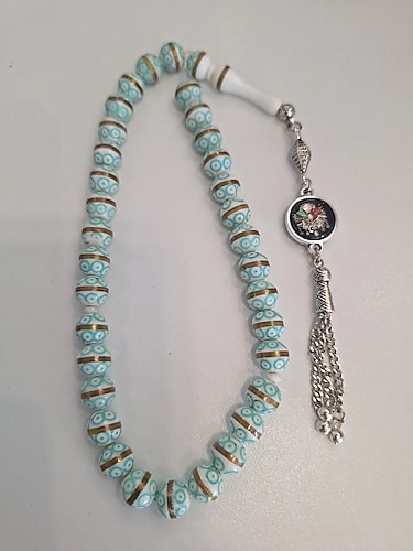 9.5 mm ölçülerinde Pirinç Sarmalı Mineli Alpaka püsküllü Deve Kemiği Tesbih