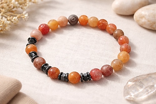 Doğal Taş Akik Bileklik – El Yapımı Şık Tasarım Doğal dokusu ve sıcak renk tonlarıyla öne çıkan bu akik taş bileklik, günlük kullanımda şıklığı ve enerjiyi bir arada sunar. Turuncu, kiremit ve bal tonlarındaki çatlak desenli akik taşları; hematit ara parçalarla dengelenerek modern ve zarif bir görünüm kazandırılmıştır. El yapımı olarak özenle hazırlanan bu bileklik, hem kadınlar hem erkekler için zamansız bir aksesuar seçeneğidir. Esnek yapısı sayesinde bileğe kolayca uyum sağlar ve gün boyu konforlu kullanım sunar.
