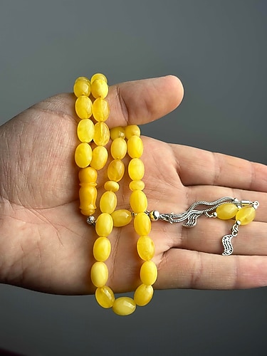 - 8,5x12mm habbe ölçülerinde - Seccar hamur - 3 yedek habbeli - 925 ayar gümüş püsküllü - Net: 21 gram, püskülü ile birlikte 24,7 gram ağırlığında - Doğal Kaya Damla Kehribar Tesbih Ü.K: 9002