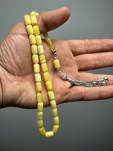7x12mm habbe ölçülerinde 1 yedek habbeli 925 ayar gümüş püsküllü Kaliningrad menşei Net 17 gram, püskülüyle 21,8 gram ağırlığında Doğal Kaya Damla Kehribar Tesbih Ü.K: 1173