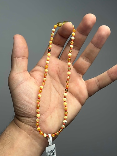 4,35 gram ağırlığında, 36 cm uzunluğunda, yaklaşık 4-5cm tane ölçülerinde, orijinal kehribar çocuk / bebek kolyesi. Ürünümüz orijinal kehribardır.