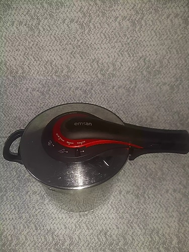 Emsan düdüklü tencere, canlı kırmızı ve gri renkleriyle dayanıklı saplara sahiptir, farklı pişirme ihtiyaçları için uygun olup 6 litrelik kapasitesi vardır.