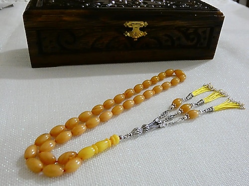 Kahramanmaraş El Oymacılık Ceviz ağacı sandığıyla 925 Ayar Gümüş Saray Püsküllü Eski Osmanlı Benzetme Emine REŞVANİ usta işçilik 8*12 mm çekimiyle renk alır muazzam hareli Orijinal Sıkma Kehribar Tesbihi.