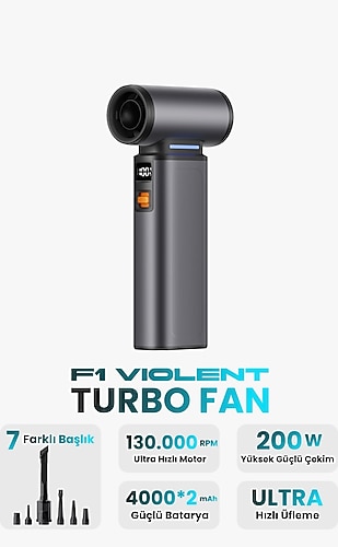 F1 Violent Turbo Jet Fan 130000RPM Ultra Güçlü Motor Güçlü Vakum 4000MAH Bataryalı Üflemeli Fırçasız bir motorla donatılmış olan mini turbo fan, basınçlı havayı güçlendirmek için gelişmiş teknolojiyi uyarlayarak vakumlama ve üflemeyi eşit derecede güçlü hale getirir! Barbekü fanı ve lastik şişirici olarak da çalışabilir. Bu kablosuz el tipi mini fan, evde veya arabada toz temizleme ihtiyaçlarınıza uygun 3 farklı kademe sunar. Hem vakumlama hem de üfleme işlevleri için çeşitli çıkarılabilir fırça başlıkları Uzun nozullar, kırıntıları veya tozu veya evcil hayvan tüylerini temizlemek için boşluklara ve köşelere ulaşmak için mükemmeldir, geniş düz emme ağzı ise emme alanlarını genişletir. Özellikler:Motor Gücü: 130000RPM Ayarlanabilir kademeli çekiş gücü Pil:4000*2 mah Paket içeriği: Violent Fan, type-C şarj kablosu, 7 adet başlık