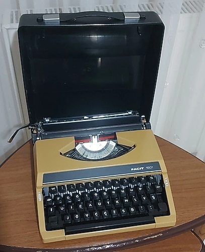 Facit 1601, F klavye antika taşınabilir daktilo, F klavye, çalışır durumda, taşıma çantası mevcut, kullanma kılavuzu bile duruyor.