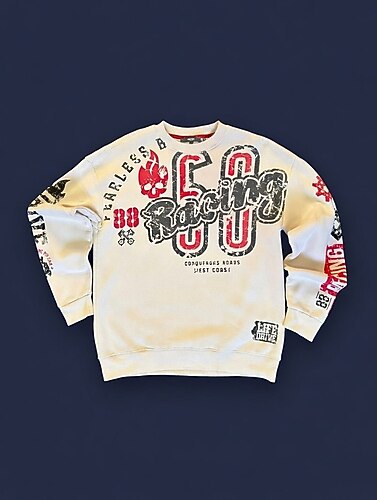 Fearless 88 Racing pullover. Krem tonu, baskılı kollar, rahat ve şık.