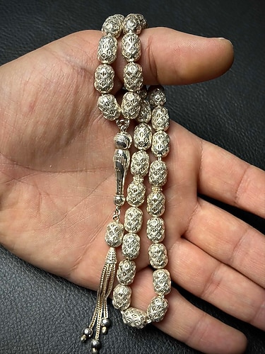 - 8,5x12mm ölçülerinde - 45,5 gram ağırlığında - Tamamı 925 ayar gümüş tesbih (püskülü, imamesi, habbesi ve ipi 925 ayar gümüştür)