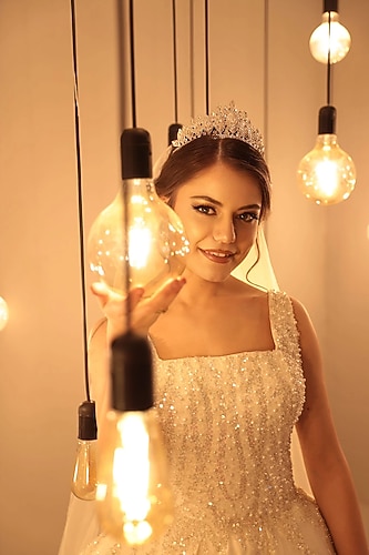 gelinliğim kristal taş ve pul işlemelidir. bel üstünde inci işlemeleri vardır. Bir iki saat giydim. rengi kırık beyazdır. tacım da fiyatın içine dahildir.