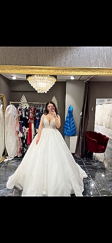 S/M bedenle uyumlu Prenses model kabarık. İnci, boncuk ve sim detayları mevcut parlak bir gelinliktir