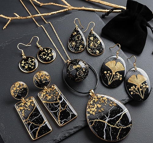 Gerçek Çiçek Detaylı Siyah Epoksi Kolye Küpe Set