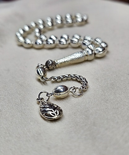 gümüş kqplama tesbih Kaliteli işçiliği ve dikkat çekici tasarımı ile öne çıkar. Tesbih, günlük kullanımda veya özel günlerde aksesuar olarak tercih edilebilir.habbe ölçüsü:6x7.5 mm dir.