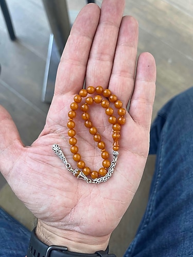 925 ayar gümüş püsküllü, küre kesim 4 parmak sıkma kehribar tesbih.