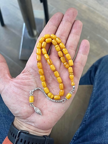 925 ayar gümüş püsküllü, kapsül kesim sıkma kehribar tesbih.