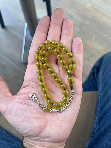 925 ayar gümüş püsküllü, özel imame altı çalışma, küre kesim, bilek boy sıkma kehribar tesbih.
