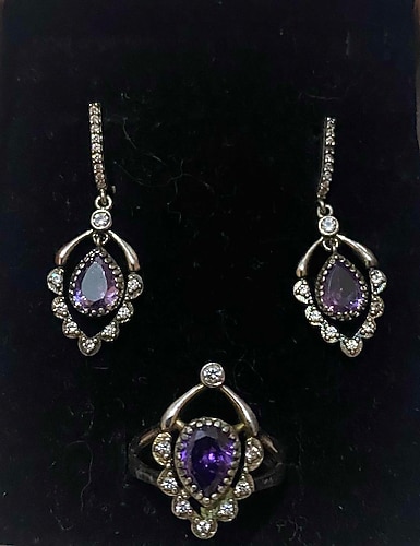 Çok Eski bir Tasarım Armut modeli Ametist Taşı ve Etrafı Şeffaf Taşlarla süslenmiş Gümüş Yüzük ve küpe Seti 5. Fotoda ayarı mevcut. yüzüğün 10 12 civarı sanırım Deforme yok İADE KABUL ETMİYORUM