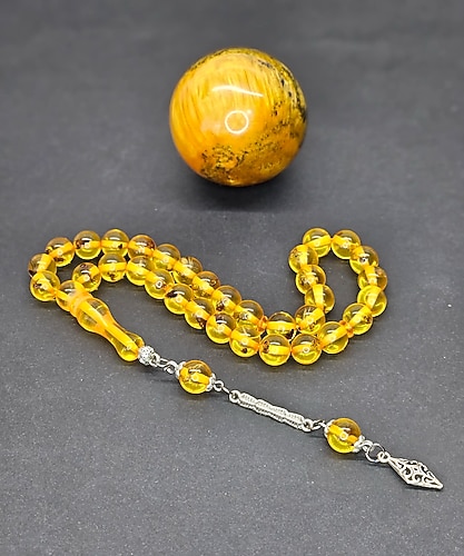 Hakiki Karınca Fosilli Toz Kehribar Tesbih'tir. habbe ölçüsü 9.5 × 9.5 mm dir.