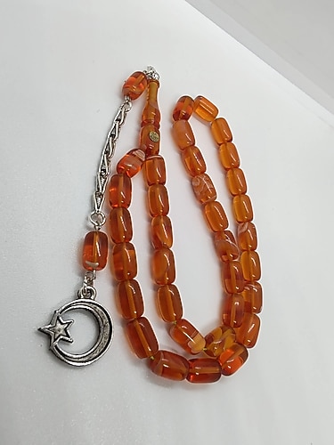 7*11 mm Ölçülerinde İsa Balkaya Atölye İşi İmame Üzeri Gömme İmzalı Gümüş Kaplama İmitasyon Ayyıldız Püskülle Dizayn Edilmiş Kızıl Beyaz Hareli Sıkma Kehribar. Alıcısına Şimdiden Hayırlı Olsun