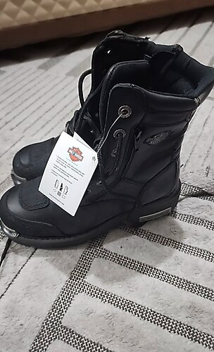 Harley Davidson siyah biker botları tokalı ve rubber malzemeden, rock punk havası ve günlük kullanım için uygundur. Gri detaylara sahiptir. su geçirmez