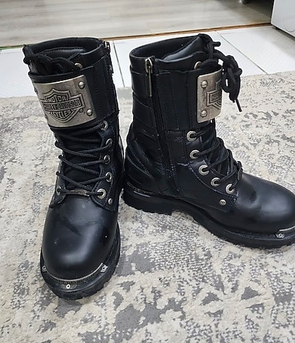 Harley Davidson Siyah deri botları, yüksek topuklu ve bağcıklı, kayışlı detaylarla rock punk havası yaratır. su geçirmez üründür