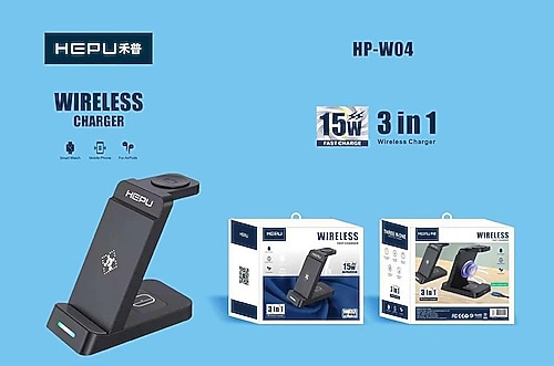 HEPU HP-W04 15W Kablosuz Şarj Cihazı 3'ü 1 Arada Şarj Yuvası Akıllı Cihazlarla Uyumlu Wireless Şarj Orijinal kutusunda, Sıfır, kullanılmamış ürün.