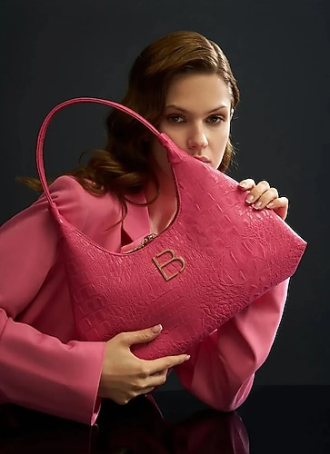 Pembe parlak deri, baskılı desene ve tokalı detaya sahip kadın omuz çantası, günlük sokak stiline cesur Parisli dokunuşu katıyor. Dokuma kumaş yapısı ile dayanıklılığı ve şık görünümü bir arada