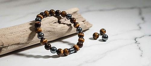 Bu bileklik, doğal Kaplan Gözü ve Hematit taşlarının bir araya gelmesiyle hazırlanmıştır. Kaplan gözü taşının kendine özgü kahverengi–altın tonları ve ışığa göre değişen doğal desenleri, bilekliğe karakteristik ve şık bir görünüm kazandırır. Hematit taşları ise metalik parlaklığıyla tasarımı tamamlar.